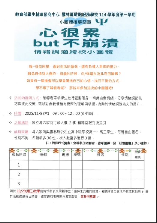 教育部學生輔導諮商中心雲林駐點服務學校114年度第一學期小團體招募簡章,歡迎本校學生踴躍參加。 瀏覽次數: 23Post author:hlvs203Post published:2025-10-09Post category:學生訊息 / 校園公告Read more articles上一篇文章轉知-115年各中央目的事業主管機關核發、委託、認證及認 可證照一覽表(402項)下一篇文章亞洲大學院系特色成果展會暨多元入學管道說明會相關內容有關汽車安全協會辦理學生交通安全繪畫徵選活動2022-03-04輔導室辦理學習歷程檔案觀摩實施計畫2023-02-14