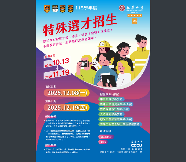 長榮大學特殊選才招生長榮大學特殊選才1下載長榮大學特殊選才2下載 瀏覽次數: 11Post author:輔導室Post published:2025-10-12Post category:學生訊息Read more articles上一篇文章亞洲大學特殊選才招生下一篇文章轉知: 文化部委託財團法人台北書展基金會承辦2026年第34屆台北國際書展「寒假趣書展」活動訊息相關內容國教署委託中山大學校辦理112年原住民生物科學人才培訓計畫,將於1月6日辦理線上生物實作課程、3月11日於本校舉辦實體生物實作課程,名額有限,敬邀本校原住民族學生參與。2022-12-16113年4月9日星期二高一學生實彈射擊體驗停課公告2024-03-27