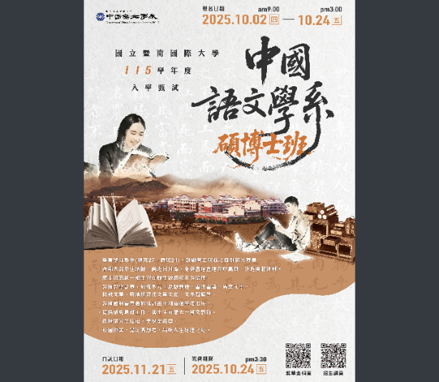 國立暨南國際大學115學年度碩、博士班入學甄試國立暨南國際大學中國語文學系碩博士班入學甄試1下載 瀏覽次數: 12Post author:輔導室Post published:2025-10-12Post category:教職員公告Read more articles上一篇文章線上講座:《蓋婭科普講座系列 52》—— 「連結訊號與心智:多模態生理訊號整合應用於精神醫學與增強認知」下一篇文章轉知-桃園市政府文化局10月11日辦理「114年桃園眷村文 化論壇《記憶與創生:眷村現場織光∞》」活動資訊。相關內容國立彰化師範大學(以下簡稱彰師大)承辦教育部「113年中等學校閩南語文教師在職進修第二專長班」招生資訊,請鼓勵本校教師報名。2024-06-05財團法人國泰人壽慈善基金會辦理「反毒宣導系列活動」2022-01-10