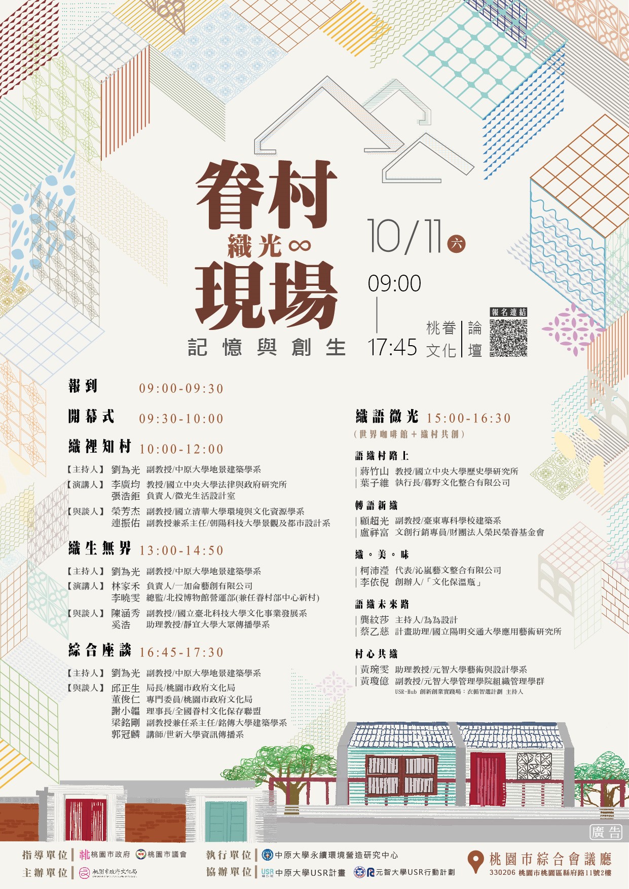 轉知-桃園市政府文化局10月11日辦理「114年桃園眷村文 化論壇《記憶與創生:眷村現場織光∞》」活動資訊。來文本文_A09030000E_1140105029_senddoc1下載來文附件_A09030000E_1140105029_senddoc1_Attach1下載眷村海報-線條版下載 瀏覽次數: 12Post author:hlvs611Post published:2025-10-13Post category:教職員公告Read more articles上一篇文章國立暨南國際大學115學年度碩、博士班入學甄試下一篇文章轉知-國立臺北大學「公共行政暨政策學系碩士在職專班」 115學年度招生訊息相關內容實習牧場雞蛋開始販售2024-09-10「2022工業管理與危機管理學術研討會」2022-02-21