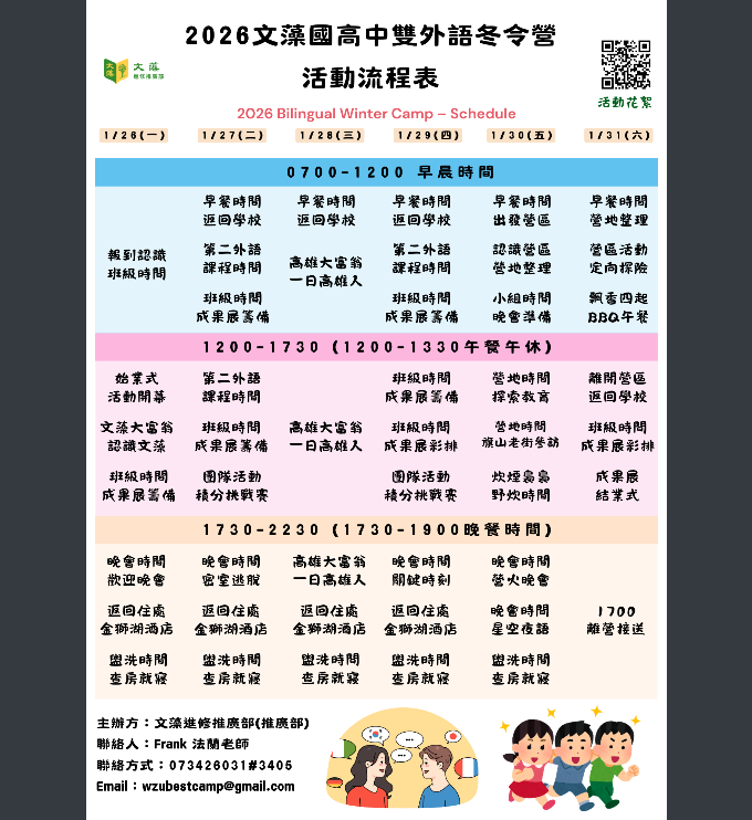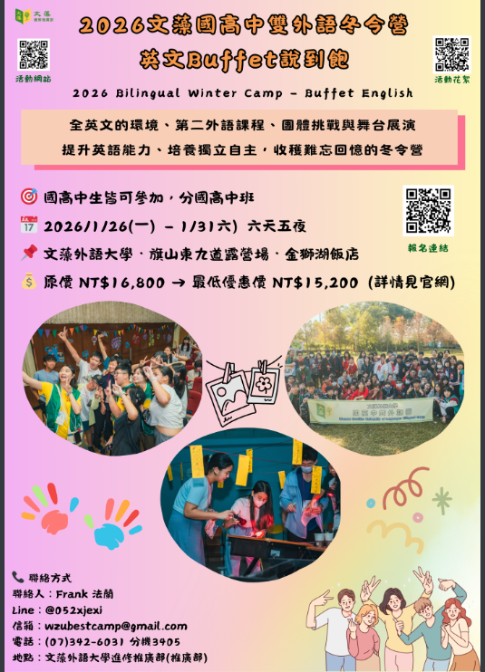 【轉知】2026文藻國高中雙外語冬令營 瀏覽次數: 5Post author:hlvs302Post published:2025-10-20Post category:學生訊息Read more articles上一篇文章【轉知】2026 寒假冬令營-卓越領袖探索系列下一篇文章【轉知】第七屆衛星科學工作坊暨臺灣太空科學聯盟學生日相關內容高級中等學校辦理國防培育班實施要點2022-09-07(轉知)桃園市政府原住民族行政局辦理「111年度補助原住民族青少年課業補習費用」申請表件。2022-08-05