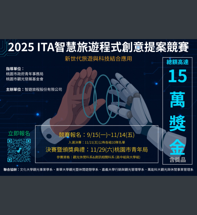 【轉知】2025 ITA智慧旅遊程式創意提案競賽 瀏覽次數: 72Post author:hlvs302Post published:2025-10-20Post category:學生訊息Read more articles上一篇文章【轉知】2026中原大學第三屆財務金融學系現金流大賽–財之呼吸 壹之型:現金流!下一篇文章【轉知】2026全國創意宋江陣頭大賽相關內容勞動部勞動力發展署提供之求職(打工)相關宣導素材及申訴管道資訊2025-03-19臺灣科學教育館辦理「114年青少年科學人才培育計畫」,鼓勵師生踴躍參加。2025-01-16