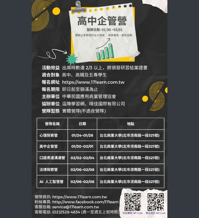 【轉知】高中企管營-2026冬令營報名開始 瀏覽次數: 11Post author:hlvs302Post published:2025-10-30Post category:學生訊息Read more articles上一篇文章H-Inno 2025全國健康產業議題專題競賽下一篇文章【轉知】2026台大生工營相關內容國立東華大學115學年度學士班特殊選才招生線上說明會2025-10-01((重要))9月24日美術科重補修上課通知2022-09-21