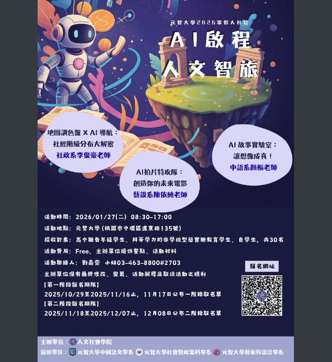【轉知】元智大學2026寒假人社營-AI啟程:人文智旅 瀏覽次數: 9Post author:hlvs302Post published:2025-10-30Post category:學生訊息Read more articles上一篇文章【轉知】2026冬令CSI鑑識體驗營下一篇文章【轉知】2026雲林詔安客家文化節相關內容南臺學校財團法人南臺科技大學舉辦2023科技棒球嘉年華活動更新資訊2023-10-19國立聯合大學請貴校師生參加本校114年5月3日(六)「2025年Open House 聯大校園開放日」活動2025-04-28
