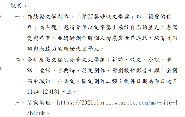 【轉知】第27屆砂城文學獎 瀏覽次數: 11Post author:hlvs302Post published:2025-10-30Post category:學生訊息Read more articles上一篇文章【轉知】2026雲林詔安客家文化節下一篇文章【轉知】心智圖超記憶親子免費講座相關內容長榮大學資訊暨設計學院、台灣虛擬網紅協會及圓剛科技辦理「第五屆虛擬網紅設計大賽」資訊(如附件)2023-09-23勞動部113年度「職場高手秘笈」勞動權益教育宣導手冊、勞動教育舞臺劇「打工完全攻略」影片,歡迎多加利用2024-05-29
