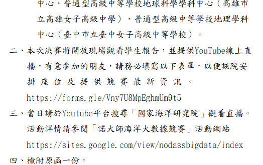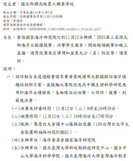 國家海洋研究院訂於11月12日辦理「2025第三屆諾大師海洋大數據競賽」決賽 瀏覽次數: 10Post author:hlvs203Post published:2025-11-04Post category:研習活動Read more articles上一篇文章教育部辦理「2025自主學習節」下一篇文章「教育部國民及學前教育署高級中等學校教師本土語文認證培訓實施計畫─第十九梯次本土語文認證輔導班」相關內容性別事件行為人防治教育及輔導處遇知能研習2025-05-23臺中市立臺中女子高級中等學校地理學科中心舉辦第十六屆全國高中社會領域素養導向評量設計競賽,鼓勵地理教師參加。2023-02-18