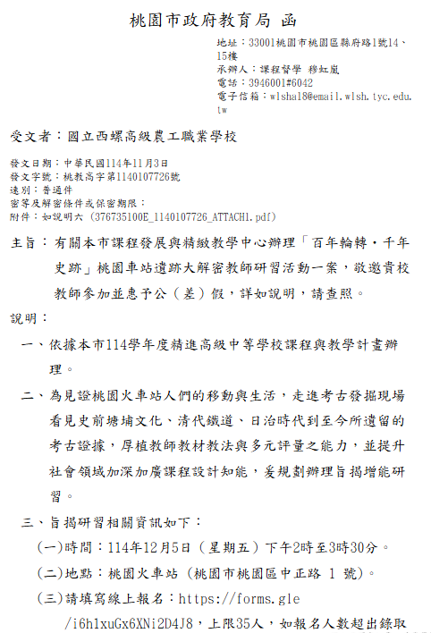 桃園市課程發展與精緻教學中心辦理「百年輪轉・千年史跡」桃園車站遺跡大解密教師研習 瀏覽次數: 11Post author:hlvs203Post published:2025-11-04Post category:研習活動Read more articles上一篇文章「教育部國民及學前教育署高級中等學校教師本土語文認證培訓實施計畫─第十九梯次本土語文認證輔導班」下一篇文章國立高雄師範大學性別教育研究所辦理「【作伙sex-see,一起談性】青年百億計畫《全球性視野 聊性不設限》瑞典參訪成果發表會」相關內容國立蘭陽女子高級中學辦理「數位科技應用:GoogleWorkspace融入教學增能工作坊」。2023-10-06國立臺灣科學教育館辦理「2023邁客盃-運算思維與創意設計大賽推廣研習」,鼓勵有興趣之教師報名參加。2023-12-06
