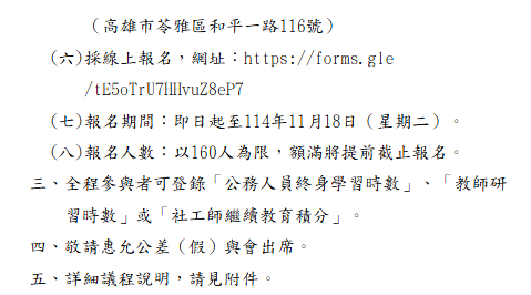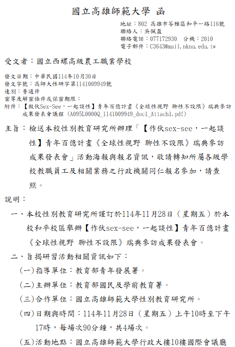 國立高雄師範大學性別教育研究所辦理「【作伙sex-see,一起談性】青年百億計畫《全球性視野 聊性不設限》瑞典參訪成果發表會」 瀏覽次數: 13Post author:hlvs203Post published:2025-11-04Post category:研習活動Read more articles上一篇文章桃園市課程發展與精緻教學中心辦理「百年輪轉・千年史跡」桃園車站遺跡大解密教師研習下一篇文章生命教育學科中心研習送到家靈性、自我與生命關懷主題課程相關內容普通型高級中等學校生物學科中心111學年度全國教師增能研習「探究與實作課程模組設計與操作實務:生物與化學跨科模組」實施計畫1份,請生物科及化學科領域有興趣之教師踴躍參加。2023-03-22臺中家事商業高級中等學校辦理推動高級中等學校創新教學工作,規劃辦理「112年度創新教學知能研習」,請教師踴躍報名參加。2023-05-29