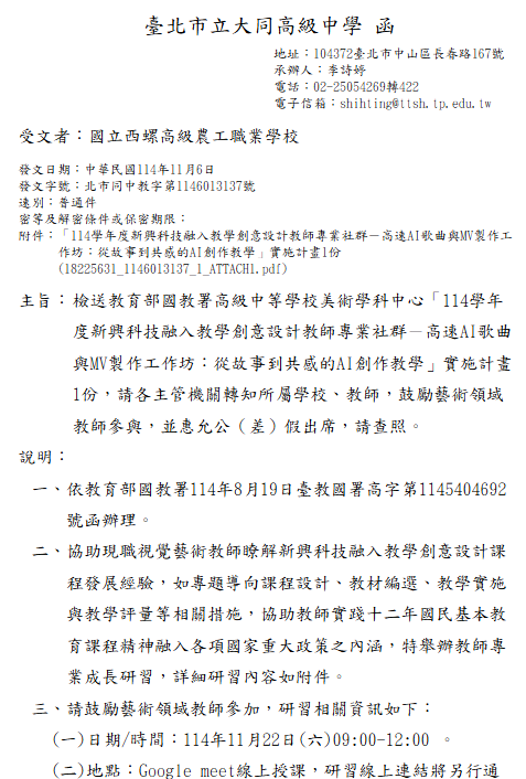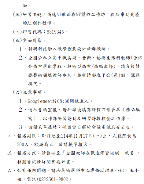 教育部國教署高級中等學校美術學科中心「114學年度新興科技融入教學創意設計教師專業社群-高速AI歌曲與MV製作工作坊:從故事到共感的AI創作教學」 瀏覽次數: 7Post author:hlvs203Post published:2025-11-10Post category:研習活動Read more articles上一篇文章台日重症兒照顧實務交流國際研討會下一篇文章114年度觸動創新教學工作坊相關內容教育部公民與社會學科中心與台灣媒體觀察教育基金會合作辦理「公民好好玩—遊戲融入教學活動之課程設計分享」,敬邀本校教師參加。2022-10-28財團法人大學入學考試中心基金會大學入學考試中心辦理「112學年度起適用之大學入學考試宣導會議-歷史科」。2023-09-13
