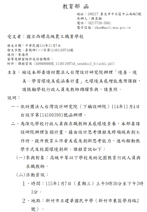 財團法人台灣設計研究院辦理「境善.境美-學習環境美感涵養計畫」之環境美感增能應用課程 瀏覽次數: 5Post author:hlvs203Post published:2025-11-10Post category:研習活動Read more articles上一篇文章國立臺南第二高級中學資訊科技學科中心辦理「114學年度議題融入研習活動」下一篇文章SDGs過程戲劇體驗工作坊(線上)相關內容教育部高級中等學校美術學科中心「111學年度美術/音樂學科性別平等議題融入課程地圖交流論壇」實施計畫1份,鼓勵對性別平等教育議題有興趣之美術、音樂及藝術相關教師參加。2022-09-30德明財經科技大學辦理「北一區技高課程學習成果分享座談會(商管群)」。2023-10-06