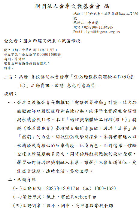 SDGs過程戲劇體驗工作坊(線上) 瀏覽次數: 5Post author:hlvs203Post published:2025-11-10Post category:研習活動Read more articles上一篇文章財團法人台灣設計研究院辦理「境善.境美-學習環境美感涵養計畫」之環境美感增能應用課程下一篇文章「慰安婦」迷你策展教具箱種子師資研習相關內容中華民國圖書館學會七十週年系列活動「輪轉的醫學圖書館學術研討會」,請踴躍參加。2023-10-26國立彰化女子高級中學舉辦112年度適性教學教材研發中心學校工作坊,辦理第二場研習課程,鼓勵教師報名參加。2023-07-12