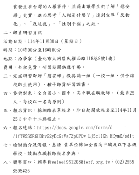 「慰安婦」迷你策展教具箱種子師資研習 瀏覽次數: 5Post author:hlvs203Post published:2025-11-11Post category:研習活動Read more articles上一篇文章SDGs過程戲劇體驗工作坊(線上)相關內容國立中山大學辦理第23期圖書館專業人員在職進修學分班上學期招生簡章2023-08-16高中階段身心障礙學生融合教育的跨專業合作同儕融入與適性發展策略與案例研習2025-06-30