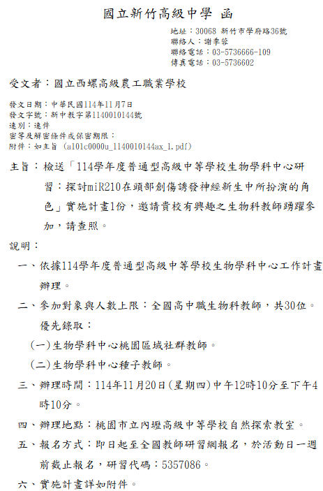 114學年度普通型高級中等學校生物學科中心研習:探討miR210在頭部創傷誘發神經新生中所扮演的角色 瀏覽次數: 11Post author:hlvs203Post published:2025-11-13Post category:研習活動Read more articles上一篇文章心理學幫我們把「支持」說得剛剛好下一篇文章114學年度普通型高級中等學校生物學科中心研習:IntotheWILD:Whenmicrobesmeetimmunity相關內容「Cool English 英語線上學習平臺 Sketch Engine 語料庫工作坊」課程表1份,請本校所屬教師踴躍報名參加。2023-04-26教育部公民與社會學科中心與台灣媒體觀察教育基金會合作辦理「公民好好玩—遊戲融入教學活動之課程設計分享」,敬邀本校教師參加。2022-10-28