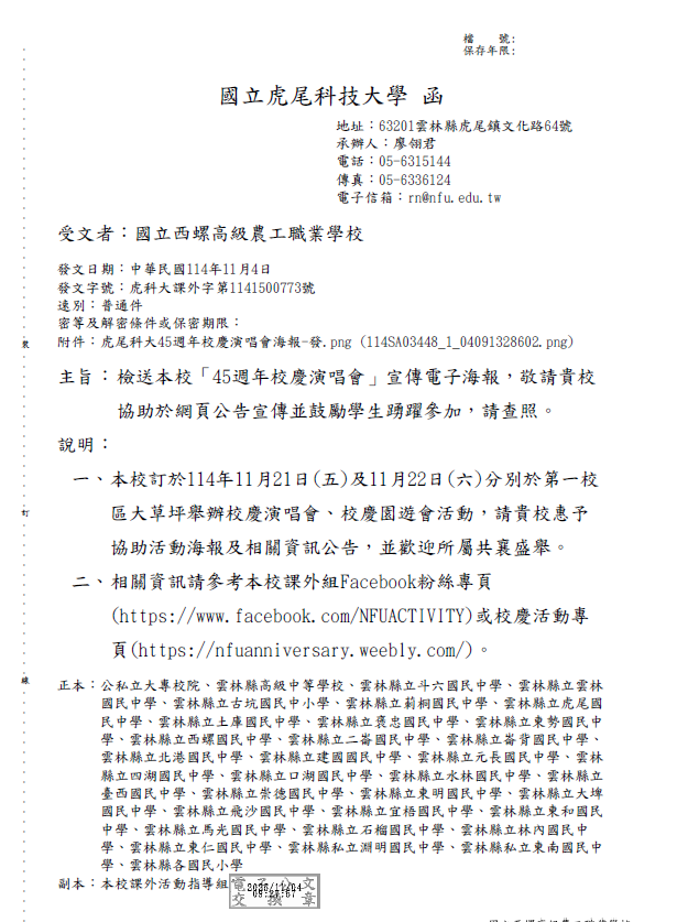 【轉知】國立虎尾科技大學「45週年校慶演唱會」宣傳電子海報 瀏覽次數: 7Post author:hlvs302aPost published:2025-11-13Post category:學生訊息Read more articles上一篇文章【轉知】國立清華大學114學年度寒假期間辦理營隊資訊下一篇文章【轉知】國立中興大學2026年寒假Python程式設計系列、ACP與SSE色彩學國際證照輔導、AI應用故事 X 探索島系列招生海報與簡章,即日起開放報名相關內容轉知:國教署性別平等教育資源中心發展性別平等教育之學習卡、海報及推薦書單,請轉知校內教師參考運用。2025-05-06國立東華大學通識教育中心111年大學部準新生暑期先修課程開放報名,同時亦開放大學部學生及高中職學生報名選修。2022-06-16