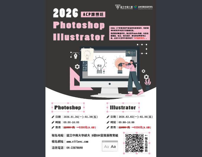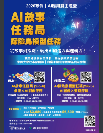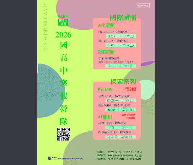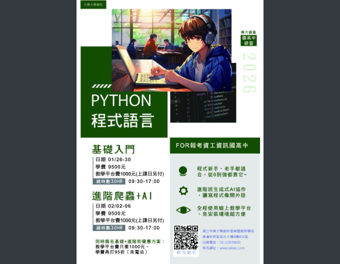 【轉知】國立中興大學2026年寒假Python程式設計系列、ACP與SSE色彩學國際證照輔導、AI應用故事 X 探索島系列招生海報與簡章,即日起開放報名 瀏覽次數: 7Post author:hlvs302aPost published:2025-11-13Post category:學生訊息Read more articles上一篇文章【轉知】國立虎尾科技大學「45週年校慶演唱會」宣傳電子海報相關內容教育部-外交小尖兵-英語種籽隊選拔活動,鼓勵學生踴躍組隊報名參加。2024-07-01110年度「防制學生藥物濫用暨校園安全宣導」動態才藝競賽實施計畫2021-09-10