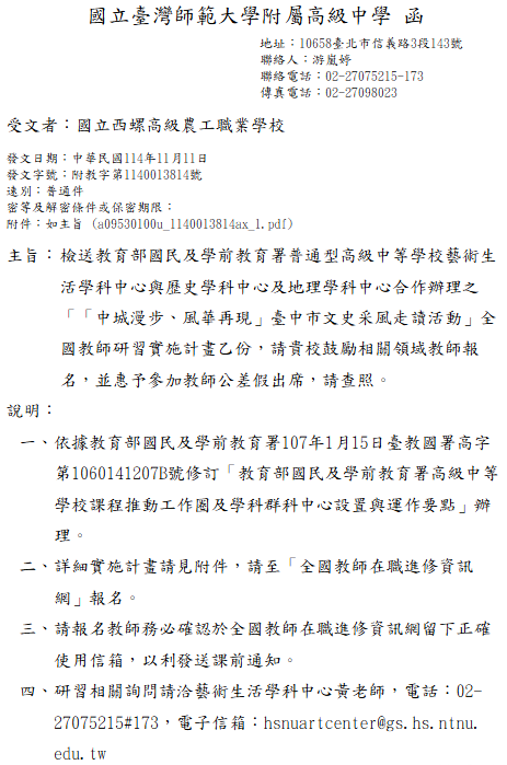 「「中城漫步、風華再現」臺中市文史采風走讀活動」全國教師研習「中城漫步、風華再現」臺中市文史采風走讀活動下載 瀏覽次數: 5Post author:hlvs203Post published:2025-11-14Post category:研習活動Read more articles上一篇文章「「走入彰化」從廟埕、市場到北管文化」全國教師研習下一篇文章114學年度社會跨科探究與實作教師增能實地工作坊─文化資產教育上路觀察:臺北寶藏巖相關內容國立清華大學執行「素養教育課程設計及發展計畫」,訂於112年5月27日(星期六)辦理「成果發表暨研討會」,鼓勵本校教師踴躍投稿並參與發表。2023-03-30客家委員會客語科技化及數位化教育第2次成果發表會計畫2022-05-06