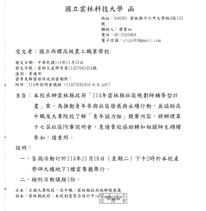 【轉知】國立雲林科技大學辦理「114年雲林縣社區規劃師輔導型計畫」第十七屆社區PK賽說明會「114-年雲林縣社區規劃師輔導型計畫」第十七屆社區-PK-賽說明會下載 瀏覽次數: 5Post author:hlvs302aPost published:2025-11-14Post category:學生訊息Read more articles上一篇文章【轉知】國立彰化師範大學辦理之「SDGs 飛英任務 – 年終超級打卡王爭霸賽」活動辦法1份下一篇文章【轉知】南華大學辦理2025全國高中職「異色盃」競賽徵件簡章相關內容國立臺灣師範大學舉辦大學程式設計先修檢測(APCS)歡迎學生踴躍報名參加。2023-08-30第1111010梯次全國高級中等學校閱讀心得寫作比賽,投稿日自111年09月01日起至111年10月10日中午12:00止,敬請踴躍參加2022-08-29