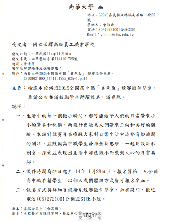 【轉知】南華大學辦理2025全國高中職「異色盃」競賽徵件簡章南華大學-2025-全國高中職「異色盃」競賽徵件簡章下載 瀏覽次數: 7Post author:hlvs302aPost published:2025-11-14Post category:學生訊息Read more articles上一篇文章【轉知】國立雲林科技大學辦理「114年雲林縣社區規劃師輔導型計畫」第十七屆社區PK賽說明會下一篇文章【轉知】輔英科技大學辦理USR x SIG培力活動「2025智慧健康科技產學論壇暨產業科技展」相關內容112學年度第二學期高一.高二第二次月考試科目時間表2024-04-30農業部推動「青年農民農業經營準備金方案」2025-08-04