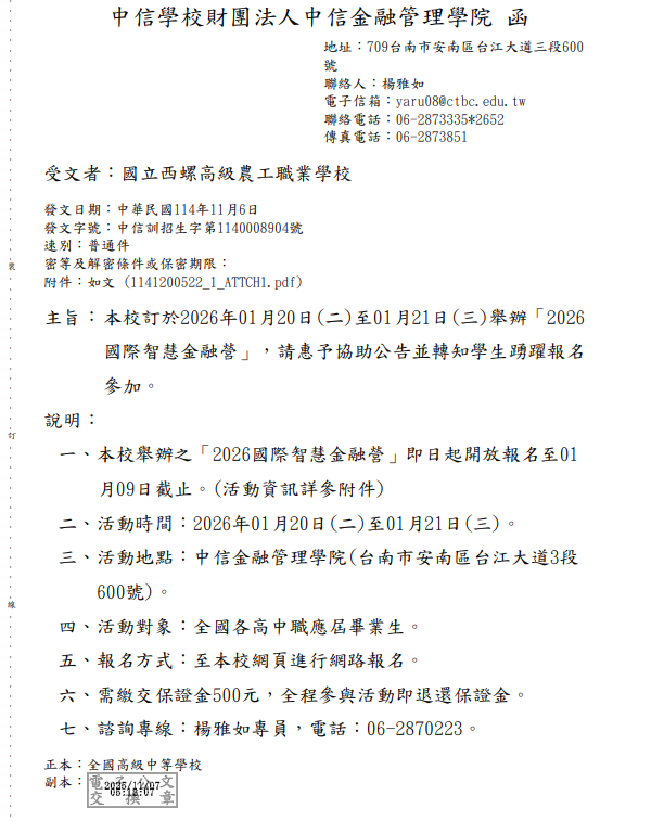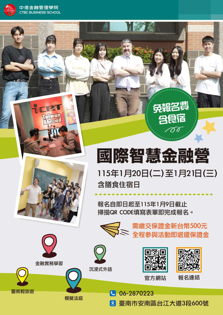 【轉知】中信學校財團法人中信金融管理學院2026年01月20日(二)至01月21日(三)舉辦「2026國際智慧金融營」 瀏覽次數: 5Post author:hlvs302aPost published:2025-11-14Post category:學生訊息Read more articles上一篇文章【轉知】醒吾學校財團法人醒吾科技大學2025醒吾新聲校園爭霸賽簡章下一篇文章【轉知】社團法人中華民國應用商業管理協會口語表達溝通營(不過夜營隊)-2026冬令營活動相關內容萬能學校財團法人萬能科技大學化妝品應用與管理系辦理「妝點未來XAI智能美學創意研習營2024-11-21中國文化大學2024華岡藝展《艷麗俄羅斯綺響》本校音樂學系年度系展2024-04-17