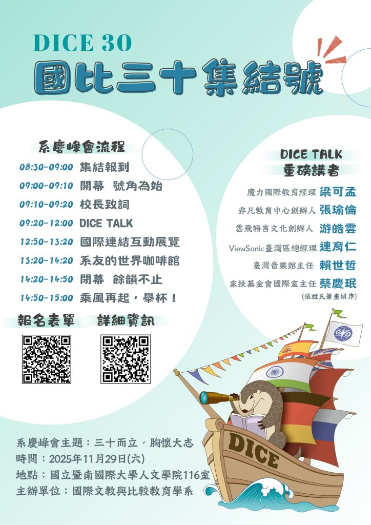 【轉知】國立暨南國際大學國際文教與比較教育學系辦理系慶「三十而立,胸懷大志」國立暨南國際大學函下載 瀏覽次數: 6Post author:hlvs302aPost published:2025-11-14Post category:學生訊息Read more articles上一篇文章【轉知】國立臺灣藝術大學辦理「2026雕塑創作體驗營」下一篇文章【轉知】中國文化大學辦理「歐美感官語藝營」相關內容亞洲大學聽力暨語言治療學系第五屆聽語營2023-06-12國立政治大學民族學系將於114年3月15日(六)下午3點舉行學系 線上說明會2025-03-13