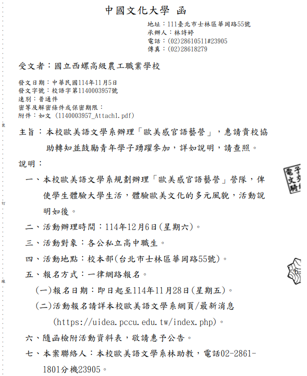【轉知】中國文化大學辦理「歐美感官語藝營」活動資料表下載 瀏覽次數: 7Post author:hlvs302aPost published:2025-11-14Post category:學生訊息Read more articles上一篇文章【轉知】國立暨南國際大學國際文教與比較教育學系辦理系慶「三十而立,胸懷大志」相關內容「全民英檢」中級測驗現正報名中,另免費備考資源「全民英檢 i學網」(GEPT iPrep)同步開放(詳見附件平台簡介),可體驗完整聽讀模擬試題並即時獲成績與個人化強弱項分析,請公告周知並鼓勵學生多加利用。2025-02-14國立宜蘭大學為協助高中職學生提前認識大學並了解各系於113年暑假期間辦理高中主題營隊活動色特於113年暑假期間辦理高中主題營隊活動2024-05-16