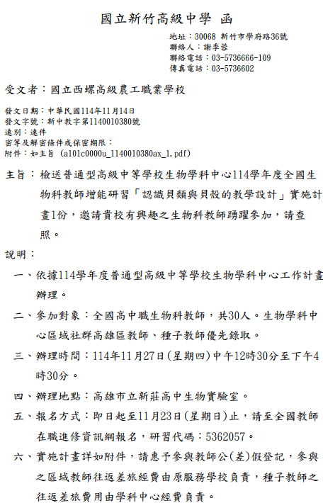 普通型高級中等學校生物學科中心114學年度全國生物科教師增能研習「認識貝類與貝殼的教學設計」全國生物科教師增能研習「認識貝類與貝殼的教學設計」實施計畫下載 瀏覽次數: 4Post author:hlvs203Post published:2025-11-15Post category:研習活動Read more articles上一篇文章國立臺北科技大學開設6門磨課師(MOOCs)課程下一篇文章「海山學」融入臺北大學 USR 課程的歷程及其實踐工作坊相關內容國立清華大學語文中心47期外語推廣課程「自主學習,遠距上線!」方案,歡迎教職員與學生報名。2022-08-15教育部促進產學連結合作育才平臺辦理之112年教師實務研習課程,歡迎教師踴躍報名參加2023-07-05