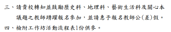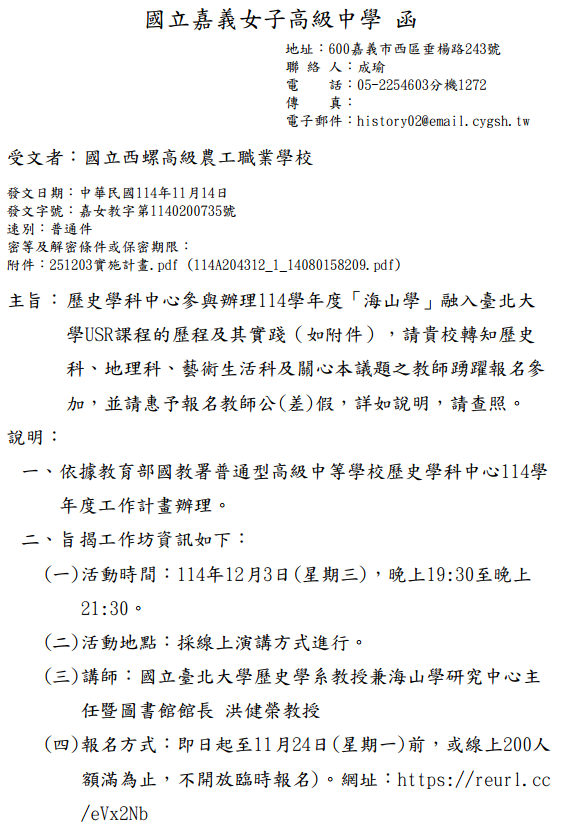 「海山學」融入臺北大學 USR 課程的歷程及其實踐工作坊「海山學」融入臺北大學-USR-課程的歷程及其實踐下載 瀏覽次數: 4Post author:hlvs203Post published:2025-11-15Post category:研習活動Read more articles上一篇文章普通型高級中等學校生物學科中心114學年度全國生物科教師增能研習「認識貝類與貝殼的教學設計」相關內容教育部普通高級中學課程藝術生活學科中心「111-1研究暨種子教師公開觀議課」實施計劃乙份,歡迎踴躍參加。2022-09-26國立臺灣師範大學附屬高級中學辦理「112-1社會領域探究與實作課程設計分享-地理與人文社會科學研究【一起動手動腳學地理】。2023-10-20
