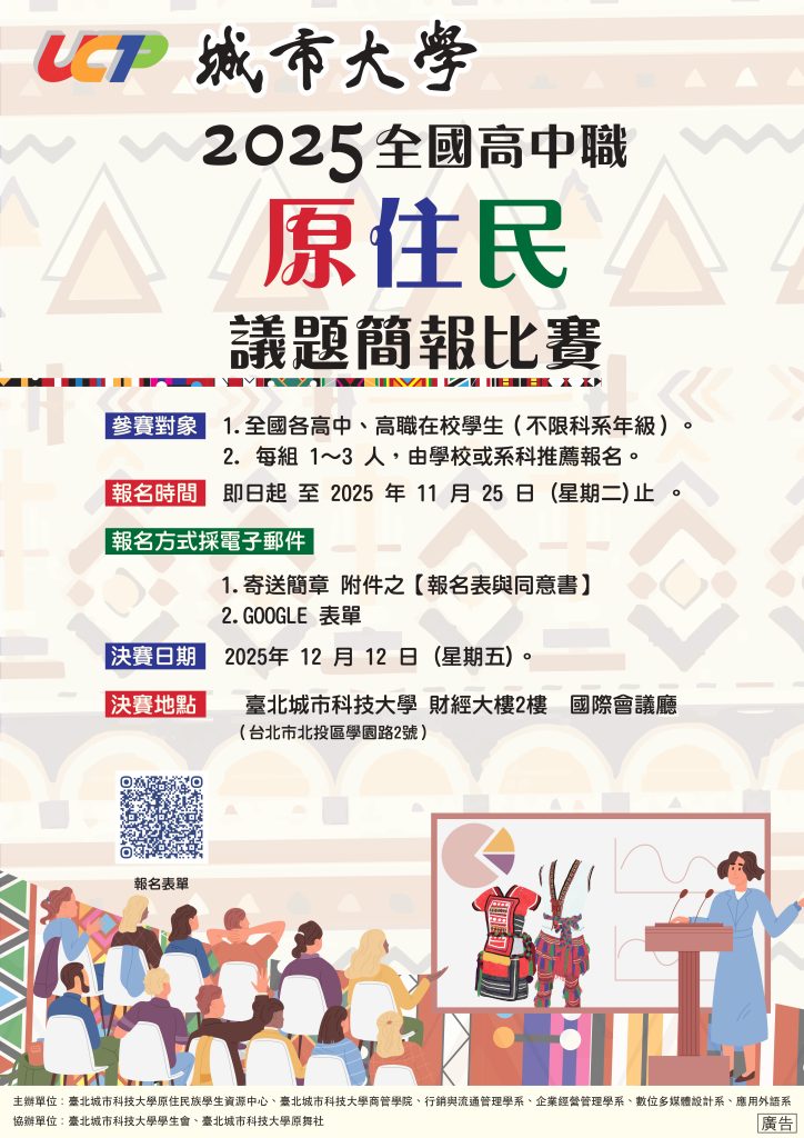 【轉知】城市學校財團法人臺北城市科技大學辦理「2025年全國高中職原住民議題簡報比賽」公文下載比賽辦法下載報名表及同意書下載 瀏覽次數: 69Post author:hlvs302aPost published:2025-11-17Post category:學生訊息Read more articles上一篇文章【轉知】健行學校財團法人健行科技大學114年11月24日至11月28日舉辦第9屆排灣族文化週「semancaucau 聲命的開場白」系列活動下一篇文章【轉知】臺中榮民總醫院舉辦「115年青少年智慧醫療暨誠信研習營」相關內容國立陽明交通大學機械工程學系將於7月7日至7月11日舉辦「2025陽明交通大學機械創科營」2025-04-22113年4月9日星期二高一學生實彈射擊體驗停課公告2024-03-27