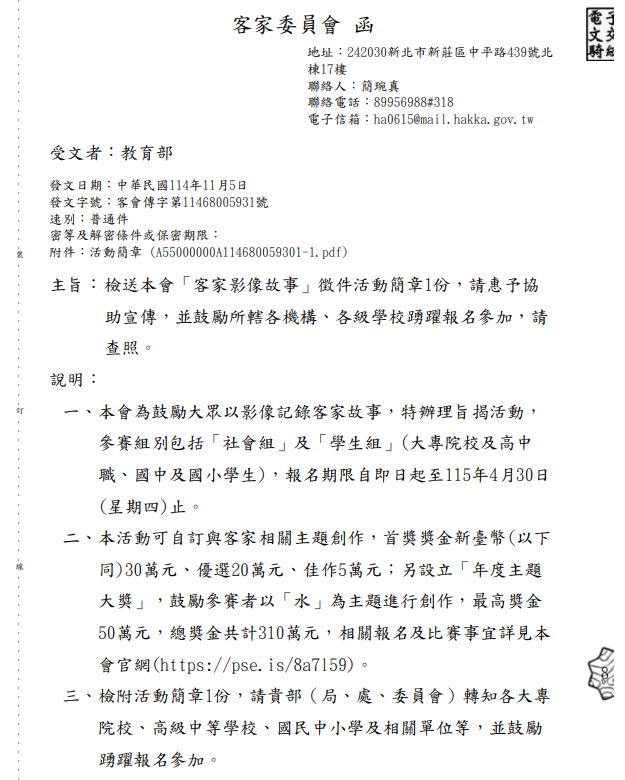 【轉知】客家委員會「客家影像故事」徵件活動 瀏覽次數: 8Post author:hlvs302aPost published:2025-11-17Post category:學生訊息Read more articles上一篇文章【轉知】臺中榮民總醫院舉辦「115年青少年智慧醫療暨誠信研習營」下一篇文章【函轉】教育部「113-115年臺灣台語卡通、動畫字幕製作及 配音工作計畫」114年成果一案,請師生參採運用相關內容國教署「性別平等教育資源中心」及「校園性別事件防治資源中心」網站整併至「友善校園學生事務與輔導工作資訊網」之網址變更如說明2023-09-17中國科技大學財務金融系舉辦「2025中國科大金融科技營」,請協助公告周知並鼓勵師生踴躍報名,2025-01-17