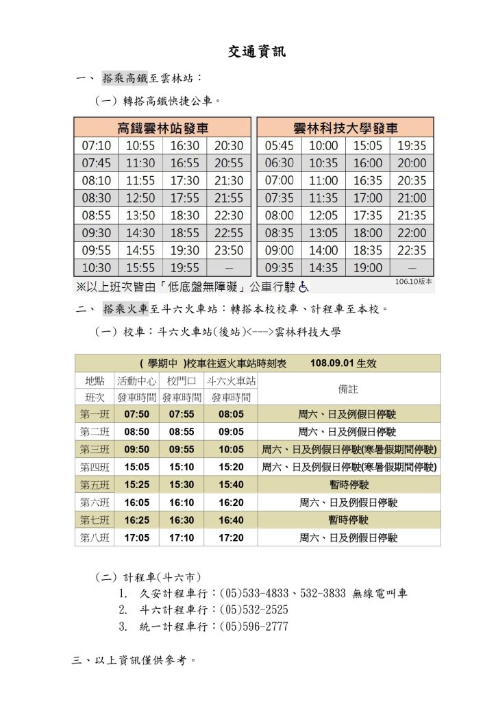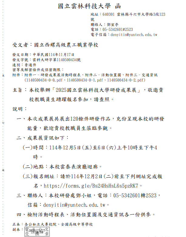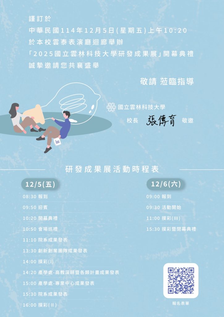 【轉知】國立雲林科技大學舉辦「2025國立雲林科技大學研發成果展」 瀏覽次數: 5Post author:hlvs302aPost published:2025-11-20Post category:學生訊息Read more articles上一篇文章【轉知】世新大學辦理「2026年全國高中職日本文化體驗營」簡章及活動海報下一篇文章【轉知】臺灣地質公園學會舉辦「第六屆臺灣地質公園學會讀景比賽」相關內容嘉藥學校財團法人嘉南藥理大學辦理「教育部推動第三期大學社會責任實踐計畫『112年西港意象創意海報設計競賽』2023-09-28客家委員會「111年度客語能力中級暨中高級認證」及「111年度客語能力高級認證」報名事宜2022-06-28