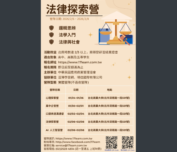 【轉知】社團法人中華民國應用商業管理協會舉辦「法律探索營-2026冬令營」社團法人中華民國應用商業管理協會函-1下載 瀏覽次數: 8Post author:hlvs302aPost published:2025-11-21Post category:學生訊息Read more articles上一篇文章【轉知】中華非營利組織發展協會將舉辦「115年度寒假偏鄉學校服務營隊」欲招募志工下一篇文章【轉知】財團法人商業發展研究院辦理「2026年台灣第二屆模擬聯合國會議」活動相關內容僑光科技大學「第五屆技職校院大手攜小手創新應用競賽」資訊2023-10-24國立臺北教育大學音樂學系單獨招生相關資訊2025-11-05