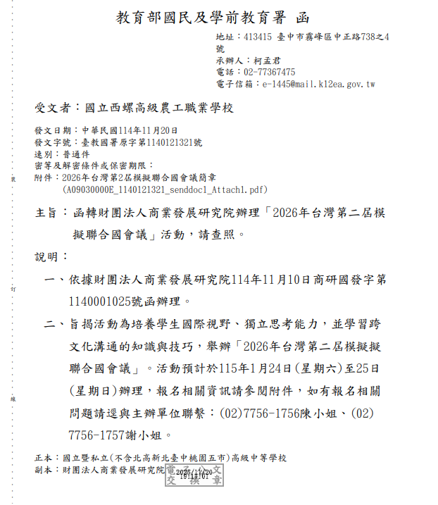 【轉知】財團法人商業發展研究院辦理「2026年台灣第二屆模擬聯合國會議」活動簡章下載 瀏覽次數: 7Post author:hlvs302aPost published:2025-11-21Post category:學生訊息Read more articles上一篇文章【轉知】社團法人中華民國應用商業管理協會舉辦「法律探索營-2026冬令營」相關內容弘光科技大學辦理學生議會舉辦之「113年全國議事規則暨學生權益研習營」計畫2024-04-17轉知:國家圖書館辦理「記憶.臺灣」論文徵稿活動,請學生踴躍投稿2025-09-18
