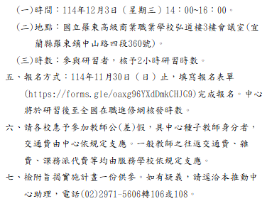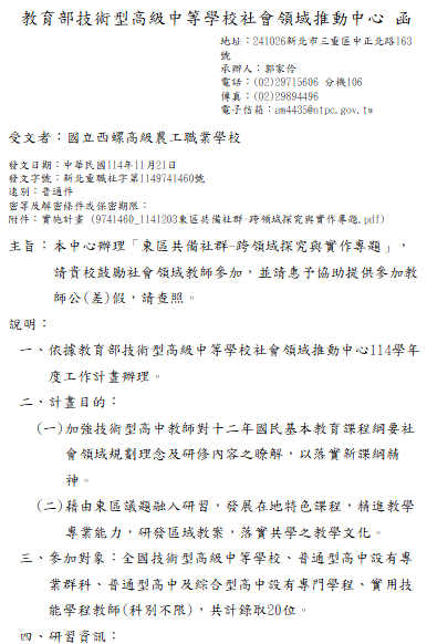 教育部技術型高級中等學校社會領域推動中心辦理「東區共備社群-跨領域探究與實作專題」1141203東區共備社群-跨領域探究與實作專題下載 瀏覽次數: 8Post author:hlvs203Post published:2025-11-23Post category:研習活動Read more articles上一篇文章教育部技術型高級中等學校社會領域推動中心「114學年度種子教師教案發表暨國家檔案館參訪」相關內容國立清華大學辦理112學年度「中等學校本土語文(原住民族語文(泰雅族語))教師在職進修第二專長學分班」招生資訊,請相關人員踴躍參加。2023-05-17國立臺灣師範大學及國立臺灣大學共同辦理「112年中小學教師氣候變遷講習活動」,鼓勵老師報名參與。2023-07-25