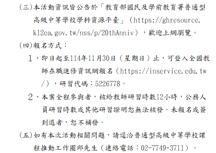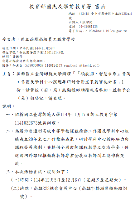 國立臺灣師範大學辦理「『領航20,智慧未來』普高工作圈及學科中心20週年研討會暨成果展實施計畫」「領航-20,智慧未來」普高工作圈及學科中心-20-週年研討會暨成果展實施計畫下載 瀏覽次數: 7Post author:hlvs203Post published:2025-11-24Post category:研習活動Read more articles上一篇文章教育部技術型高級中等學校社會領域推動中心辦理「東區共備社群-跨領域探究與實作專題」下一篇文章歷史學科中心辦理114學年度世界史專題工作坊相關內容普通型高級中等學校生活科技學科中心辦理「111學年教育部普通高級中學課程生活科技學科中心教師專業成長(一)研習」實施計畫,並請生活科技教師參加。2023-03-15國立中正大學清江進修推廣暨數位學習中心開設「111學年度第1學期進修學士、碩士學分班暨隨班附讀」招生簡章。2022-08-05