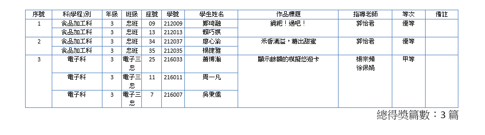 賀!本校參加全國高級中等學校114學年度第1學期小論文寫作比賽得獎同學國立西螺農工 參加教育部國民及學前教育署舉辦全國高級中等學校小論文寫作比賽 1141015梯次評審結果一覽表恭喜以上獲獎同學,感謝指導老師 瀏覽次數: 26Post author:圖書館Post published:2025-11-25Post category:學生訊息 / 校園公告 / 榮譽榜Read more articles上一篇文章轉知:教育部為「全民+1 政府相挺」普發現金領取及防詐事宜,請轉知所屬推廣運用,詳如附件,敬請參閱。下一篇文章賀!本校參加全國高級中等學校114學年度第1學期閱讀心得寫作比賽得獎同學相關內容國立臺灣師範大學辦理「112年度『Cool English 普技高自主學習』活動獎勵辦法」1份,鼓勵學生踴躍報名參加。2023-01-19國立中興大學113年暑期「國高中營- 英文網紅速成班~Fun心開口說英文!、Blender 3D初探全攻略、角色設計與插畫」招生2024-05-31