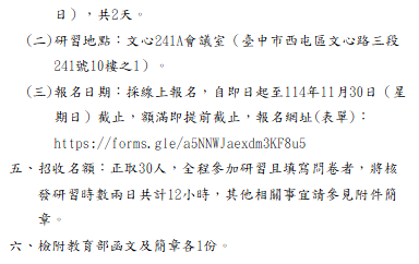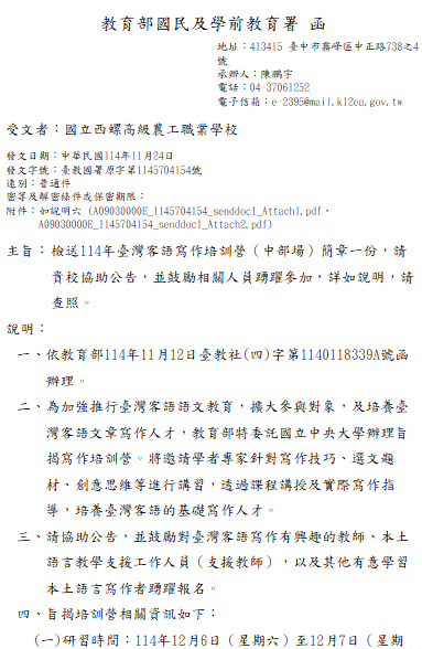 114年臺灣客語寫作培訓營(中部場)「臺灣客語寫作培訓營」簡章中部場下載 瀏覽次數: 7Post author:hlvs203Post published:2025-11-25Post category:研習活動Read more articles上一篇文章歷史學科中心辦理114學年度世界史專題工作坊下一篇文章全國自主學習相關講座:「Google AI:從抽象到實踐的教學旅程」相關內容普通型高級中等學校全民國防教育學科中心辦理111學年全民國防教育雙語課程設計實施計畫書1份,敬請本校教師(官)參加。2023-05-11台北市婦女救援社會福利事業基金會辦理迷你策展教具箱種子師資研習。2023-10-13
