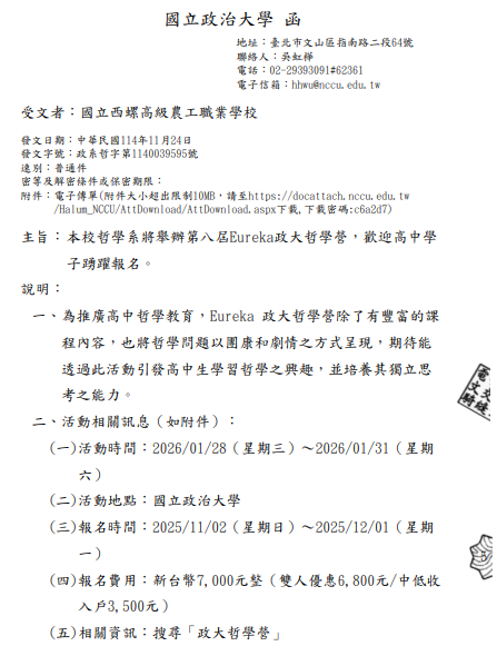 【轉知】國立政治大學哲學系將舉辦第八屆Eureka政大哲學營 瀏覽次數: 6Post author:hlvs302aPost published:2025-11-26Post category:學生訊息Read more articles上一篇文章【轉知】新北市立鶯歌陶瓷博物館舉辦之「2026全國兒少陶藝獎」相關資訊下一篇文章【轉知】國立臺灣大學生物環境系統工程學系舉辦「台大生工營」相關內容淡江大學外交日OPEN HOUSE DAY活動2025-10-12【轉知】健行學校財團法人健行科技大學與桃園市政府青年事務局合作辦理之「Romadiw露瑪遛音樂節」電子海報1份2025-11-20