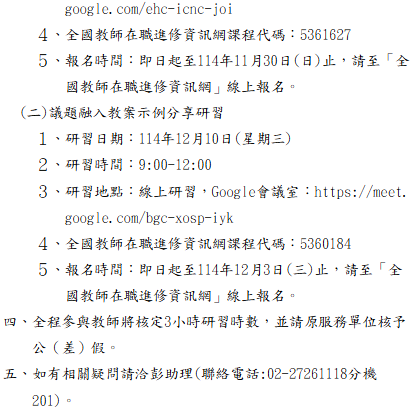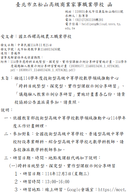 114學年度技術型高級中等學校數學領域推動中心「跨科目統整型、探究型、實作型課程示例分享研習」、「議題融入教案示例分享研習」 瀏覽次數: 9Post author:hlvs203Post published:2025-11-26Post category:研習活動Read more articles上一篇文章全國自主學習相關講座:「Google AI:從抽象到實踐的教學旅程」相關內容111學年度第一學期高中優質化及前導學校「主題策展與社會實踐」教師增能研習實施計畫。2022-12-22國立臺灣海洋大學臺灣海洋教育中心辦理「110學年度海洋教育教師社群發展經驗與實踐工作坊」之「造舟製作」計畫書1份,鼓勵教師踴躍參加。2021-11-11