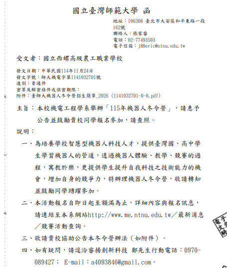 【轉知】國立臺灣師範大學機電工程學系舉辦「115年機器人冬令營」招生簡章-1下載 瀏覽次數: 3Post author:hlvs302aPost published:2025-11-27Post category:學生訊息Read more articles上一篇文章【轉知】中央研究院參與「臺灣橋梁計畫」(TAIWAN BRIDGES)邀請諾貝爾和平獎得主娜蒂雅.穆拉德女士(Ms. Nadia Murad)蒞院發表專題演講相關內容國立臺東女子高級中學辦理教育部113年度高級中等學校「『飛越海洋、創藝臺灣』海洋美學夏令營」2024-05-06中亞聯大網路成癮防治中心擬於114年5月15日舉辦「2025網路成癮防治學術研討會:網路成癮的最新發展與臨床實踐及政策應用」(實體與線上同步)2025-04-18