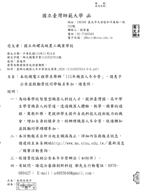 【轉知】國立臺灣師範大學機電工程學系舉辦「115年機器人冬令營」招生簡章-3下載 瀏覽次數: 9Post author:hlvs302aPost published:2025-11-28Post category:學生訊息Read more articles上一篇文章【轉知】法務部自114年11月11日起至12月10日止舉辦「114年人權影展月」活動下一篇文章【轉知】東吳大學舉辦2026年寒假高中生研習營相關內容(轉知)社團法人生命勵樂活輔健會辦理之2022教育新騎跡─「全適能 大自然療育」研習營【健康促進 VS 環境保育】活動簡章2022-07-04【轉知】高中職2026第十三屆航令營「Wingardium AIRviosa」2025-10-20