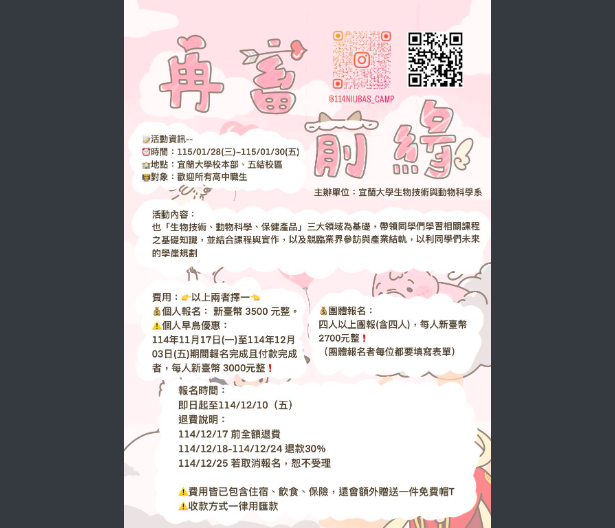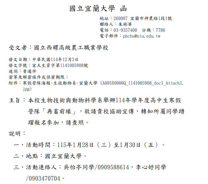 【轉知】國立宜蘭大學生物技術與動物科學系舉辦114年學年度高中生寒假營隊「再畜前緣」 瀏覽次數: 12Post author:hlvs302aPost published:2025-12-04Post category:學生訊息Read more articles上一篇文章【轉知】國立臺灣科技大學訂於明(115)年1月25日(日)至1月27日(二)辦理「2026『創AI』實作研習營」下一篇文章【轉知】國家表演藝術中心衛武營國家藝術文化中心主辦「2026藝術學習推廣國際論壇暨工作坊」活動報名訊息相關內容臺北自來水事業處及所屬工程總隊114年新進職員(工)甄試簡章2025-04-10臺北醫學大學特殊選才招生考試訊息2025-11-05