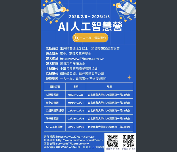 【轉知】社團法人中華民國應用商業管理協會「2026冬令營-AI人工智慧營」活動說明與海報社團法人中華民國應用商業管理協會函下載 瀏覽次數: 8Post author:hlvs302aPost published:2025-12-04Post category:學生訊息Read more articles上一篇文章【轉知】崑山科技大學資訊傳播系舉辦「思科CCST IT Support 核心能力研習」下一篇文章【轉知】國立中興大學化學系第三十屆化學營—「2026霧裡探化」宣傳活動資訊及招生簡章相關內容「2022仿生設計競賽_台灣海選高中職組」2022-03-08【轉知】高中職2026第十三屆航令營「Wingardium AIRviosa」2025-10-20