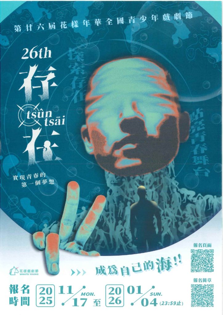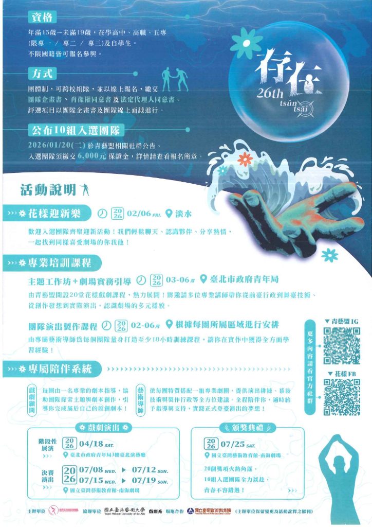 【轉知】青少年表演藝術聯盟(下稱該聯盟)辦理「第廿六屆花樣年華全國青少年戲劇節《存在》」藝文活動青少年表演藝術聯盟函下載 瀏覽次數: 7Post author:hlvs302aPost published:2025-12-04Post category:學生訊息Read more articles上一篇文章【轉知】國立臺灣師範大學營養科學學士學位學程學會辦理「2026臺師大營養營」下一篇文章【轉知】雲林縣政府託中國青年救國團直屬臺灣省雲林縣團務指導委員會於114年12月13日(六)辦理「雲林縣第六屆兒童及少年福利諮詢代表成果發表會『探索兒權公園、認識兒權公約』」相關內容亞洲大學院系特色成果展會暨多元入學管道說明會2025-10-12聯合數位文創股份有限公司113年6月14日~113年10月13日於國立臺灣科學教育館 七樓南側特展區舉辦「teamLab共創!未來園 台北」教育館 七樓南側特展區舉辦「teamLab共創!未來園 台北」2024-05-18