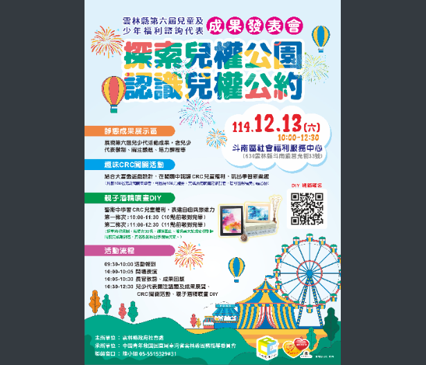 【轉知】雲林縣政府託中國青年救國團直屬臺灣省雲林縣團務指導委員會於114年12月13日(六)辦理「雲林縣第六屆兒童及少年福利諮詢代表成果發表會『探索兒權公園、認識兒權公約』」雲林縣政府-函下載 瀏覽次數: 9Post author:hlvs302aPost published:2025-12-04Post category:學生訊息Read more articles上一篇文章【轉知】青少年表演藝術聯盟(下稱該聯盟)辦理「第廿六屆花樣年華全國青少年戲劇節《存在》」藝文活動下一篇文章【轉知】「114學年度全國學生創意戲劇比賽」及「114學年度全國師生鄉土歌謠比賽」決賽報名期程資訊相關內容教育部及外交部合辦112年度「外交小尖兵─英語種籽隊選拔活動」開跑記者會。2023-08-22國立臺灣科學教育館辦理「華人資訊語文競技與創意設計大賞─2023年第四屆科學與科普專業英文能力大賽實施計畫」。2023-09-01