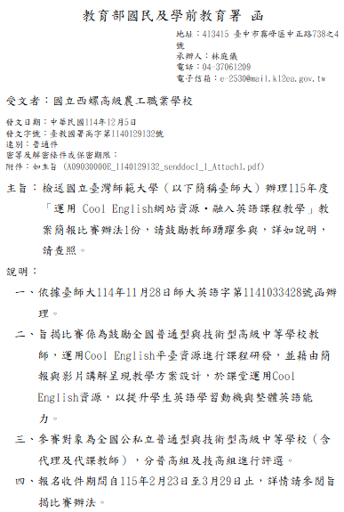 115年度「運用 Cool English網站資源‧融入英語課程教學」教案簡報比賽115-年度「運用-Cool-English-網站資源‧融入英語教學」教案簡報比賽_Attach1下載 瀏覽次數: 6Post author:hlvs203Post published:2025-12-05Post category:教職員公告Read more articles上一篇文章重申國民旅遊卡(以下簡稱國旅卡)休假補助費與國內出差旅費之交通費應本不重複請領原則,就實際情形擇一請領,並補充說明住宿費及雜費之處理原則一案相關內容國立虎尾科技大學誠徵113學年度第1學期通識教育中心微積分兼任教師。2024-04-16114學年度徵聘商借教師1名辦理師資培育相關業務,轉知本校教師相關訊息。2025-05-27