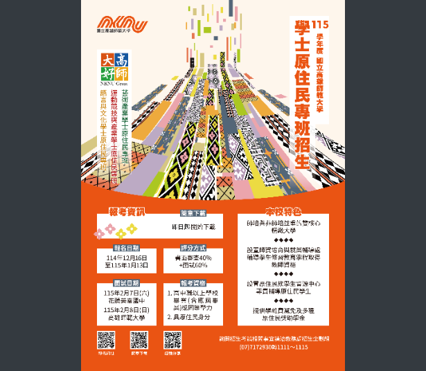 國立高雄師範大學學士原住民專班招生資訊國立高雄師範大學學士原住民專班招生資訊1下載國立高雄師範大學學士原住民專班招生資訊2下載國立高雄師範大學學士原住民專班招生資訊3下載 瀏覽次數: 15Post author:輔導室Post published:2025-12-08Post category:學生訊息 / 校園公告Read more articles上一篇文章2026世新大學社會心理學系社會心理體驗營下一篇文章國立彰化師範大學原住民專班招生相關內容「高中職生AI扎根系列活動」2022-03-28國立陽明交通大學辦理第十屆「APX全國高中數理能力(線上)檢定」內容與資訊說明,鼓勵本校同學踴躍參加。2022-10-03