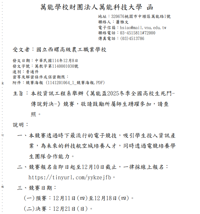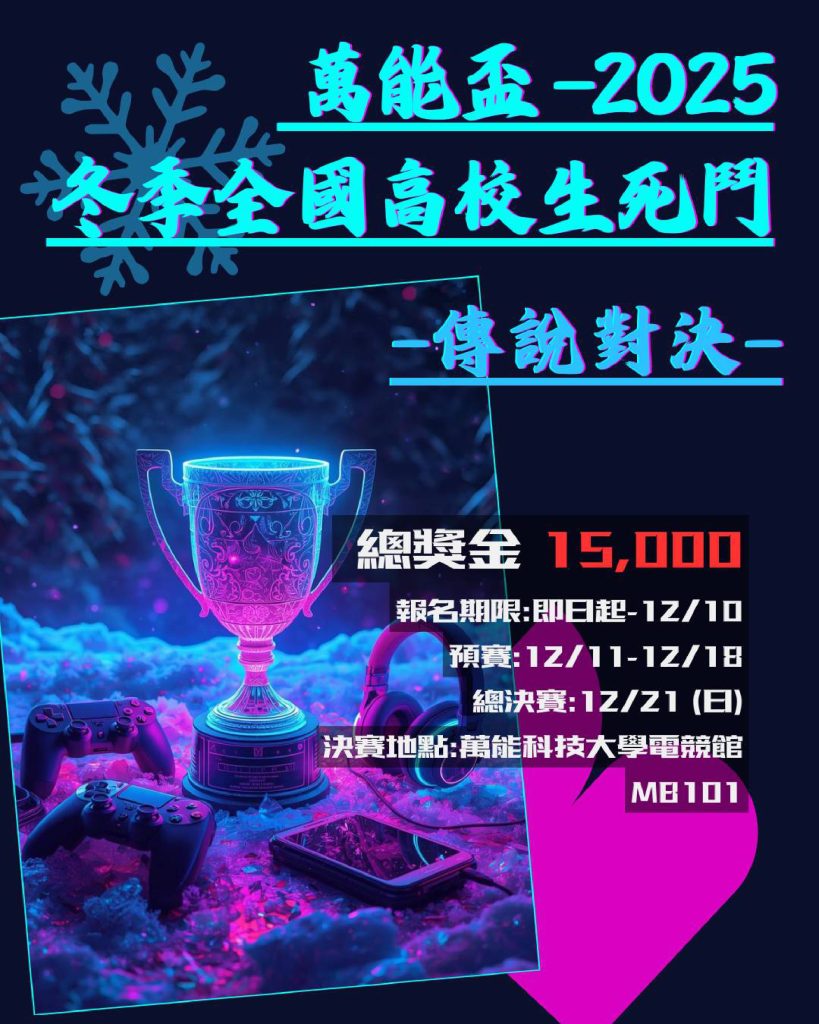 【轉知】萬能學校財團法人萬能科技大學資訊工程系舉辦《萬能盃2025冬季全國高校生死鬥-傳說對決-》競賽 瀏覽次數: 11Post author:hlvs302aPost published:2025-12-08Post category:學生訊息Read more articles上一篇文章【轉知】萬能學校財團法人萬能科技大學航空光機電系舉辦「航空修護學涯與職涯發展體驗營」冬令營研習活動下一篇文章【轉知】國家表演藝術中心衛武營國家藝術文化中心2026年【衛武營藝企學】上半年節目申請訊息相關內容國家圖書館辦理2024世界閱讀日主題活動-「大家一起『字說自畫』」活動,歡迎踴躍參與。2024-04-15國家表演藝術中心臺中國家歌劇院將於今(113)年7月20日至7月21日舉辦「2024 NTT學苑—青年營」2024-05-03
