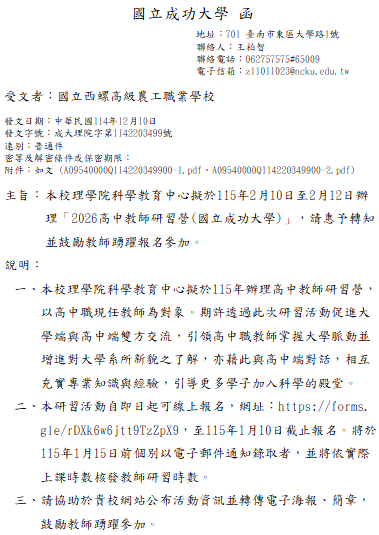 2026高中教師研習營(國立成功大學)2026-高中教師研習活動海報下載2026-高中教師研習活動簡章下載 瀏覽次數: 7Post author:hlvs203Post published:2025-12-11Post category:研習活動Read more articles上一篇文章【轉知】臺中市立臺中工業高級中等學校辦理「Google Apps Script 校園運用」研習相關內容國立嘉義女子高級中學歷史學科中心及國立東華大學原住民族發展中心聯合辦理111學年度「原住民族歷史正義與轉型正義工作坊」第二場,鼓勵歷史科教師踴躍報名參加。2022-09-16國立虎尾科技大學辦理「112學年度廣達游於藝計畫-光影巴洛克教師研習營」2023-08-07