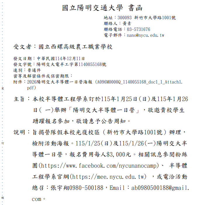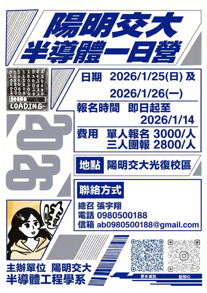 【轉知】國立陽明交通大學半導體工程學系訂於115年1月25日(日)及115年1月26日( 一)舉辦「陽明交大半導體一日營」 瀏覽次數: 7Post author:hlvs302aPost published:2025-12-12Post category:學生訊息Read more articles上一篇文章【轉知】台南家專學校財團法人台南應用科技大學舉辦「台韓大學流行音樂交流盛會」活動下一篇文章台南應用科技大學藝術類單獨招生相關內容國立虎尾科技大學「114學年度產學攜手合作計畫四技學士專班」招生訊息2025-03-19關於111年度全縣語文競賽縣賽報名注意事項2022-07-08