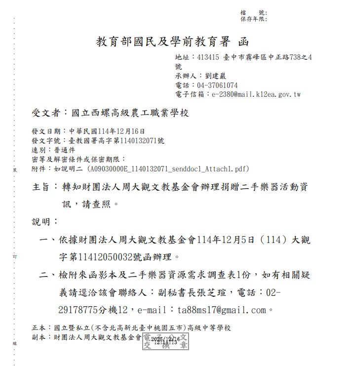 【轉知】財團法人周大觀文教基金會辦理捐贈二手樂器活動資訊財團法人周大觀文教基金會函下載 瀏覽次數: 8Post author:hlvs302aPost published:2025-12-16Post category:學生訊息Read more articles上一篇文章【轉知】淡江大學學校財團法人淡江大學資訊與圖書館學系訂於115年1月24日(星期六)舉辦「115年淡江大學第四屆資圖營:元宇宙互動光影-閱讀新體驗」活動下一篇文章【統測模擬考】12/23、12/24 高三第三次統測模擬考-考試時程表相關內容國立屏東大學「114學年度產學攜手計畫-經營管理專班」廠商招生說明會資訊2025-02-20教育部國民及學前教育署「111學年度高級中等學校英文單字比賽實施計畫」,鼓勵學生踴躍報名參加。2022-06-06